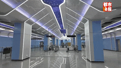 航天城站作為裝修特色站,是15號線和2號線的換乘車站,裝修設計主題為“慧聚云端、展翼載夢”。提取騰飛的翅膀作為空間設計元素,天花板采用鋁方通結合沖孔鋁板,以陣列組合的形式出現(xiàn),猶如大鵬展翅,寓意自由、力爭向上。中部透光膜布模擬出星空的效果,結合藍色烤瓷鋁板墻柱面,天地墻一體化整體設計,科技感十足。換乘通道結合航天科技畫面展示,預示著西安科技與航天事業(yè)的蓬勃發(fā)展。